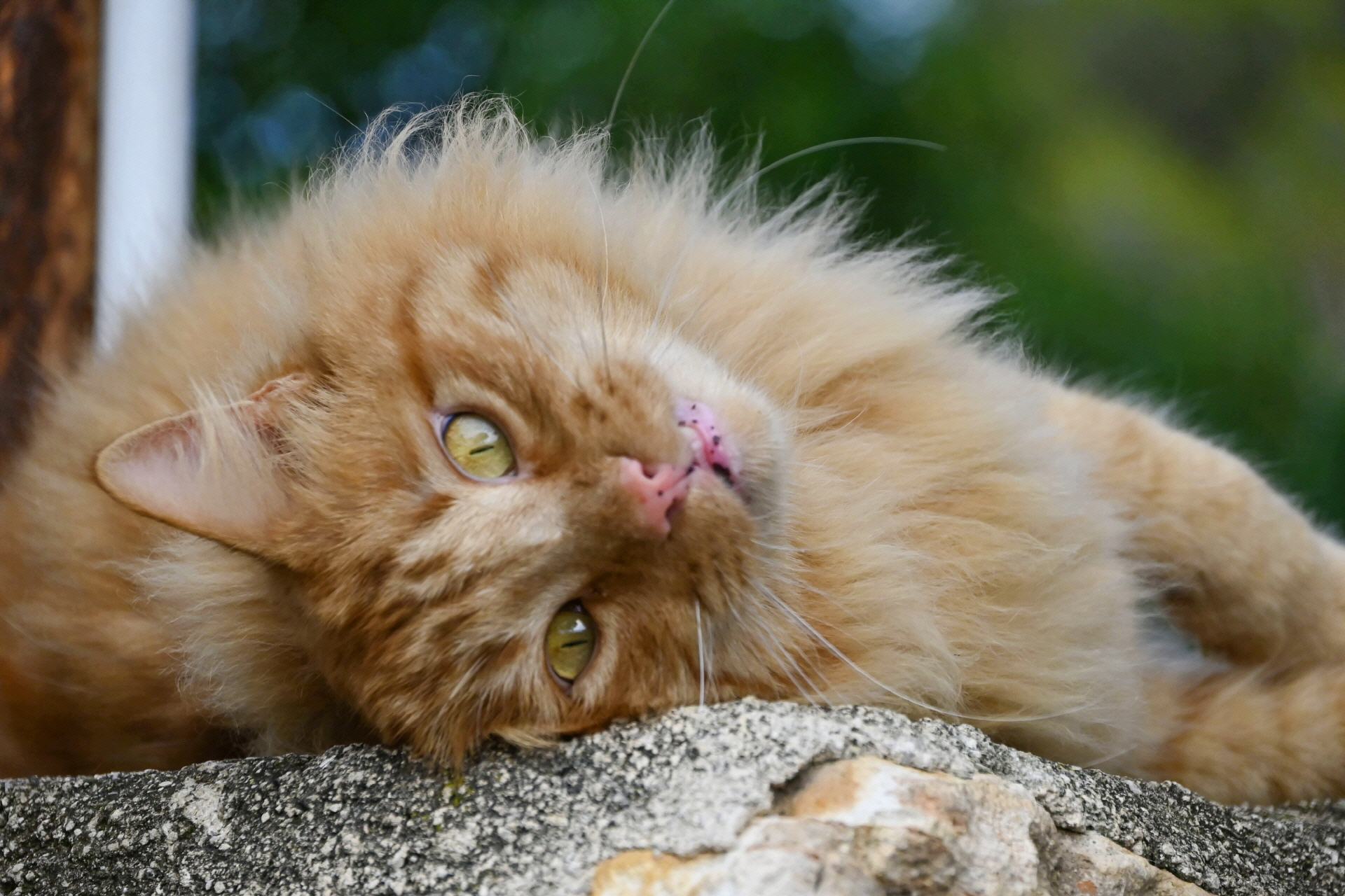 Un gato se relaja encima de una columna mientras nos observa.