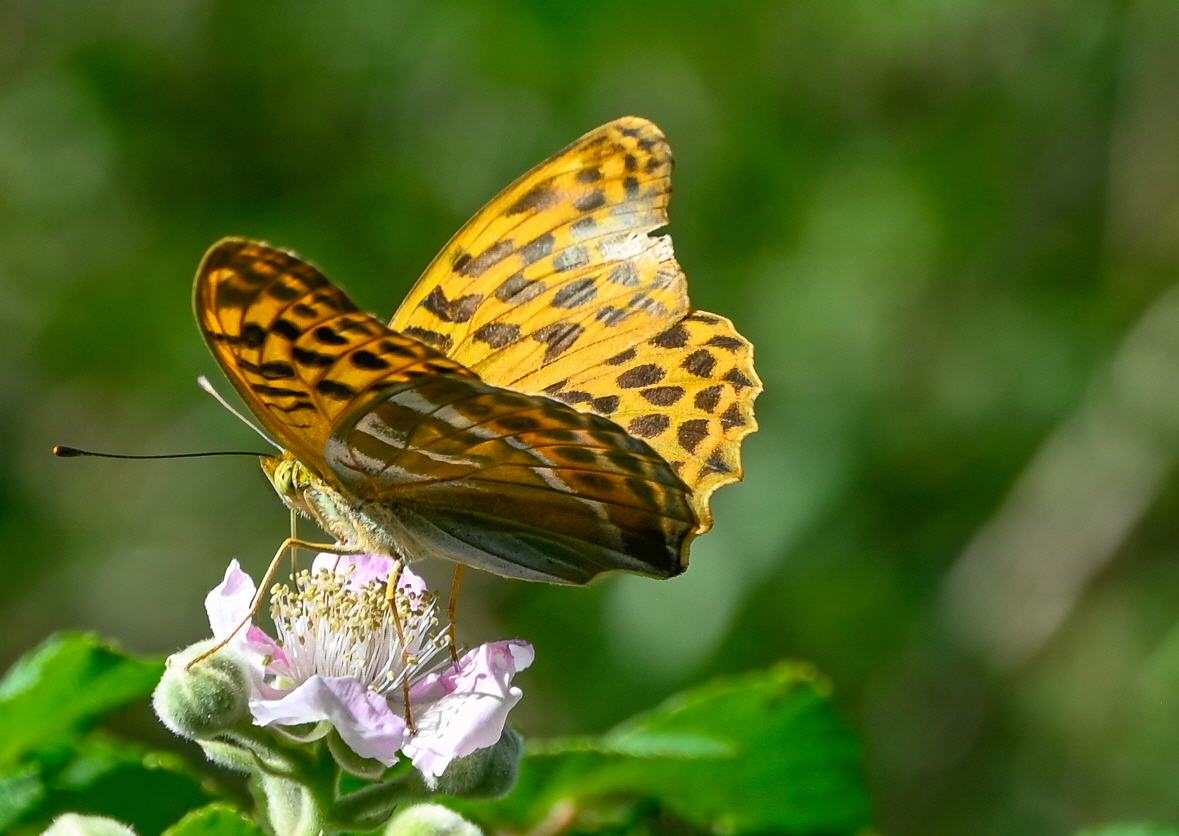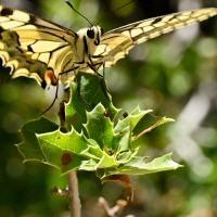 Una mariposa posa en una flor buscando el nectar del que se alimenta.