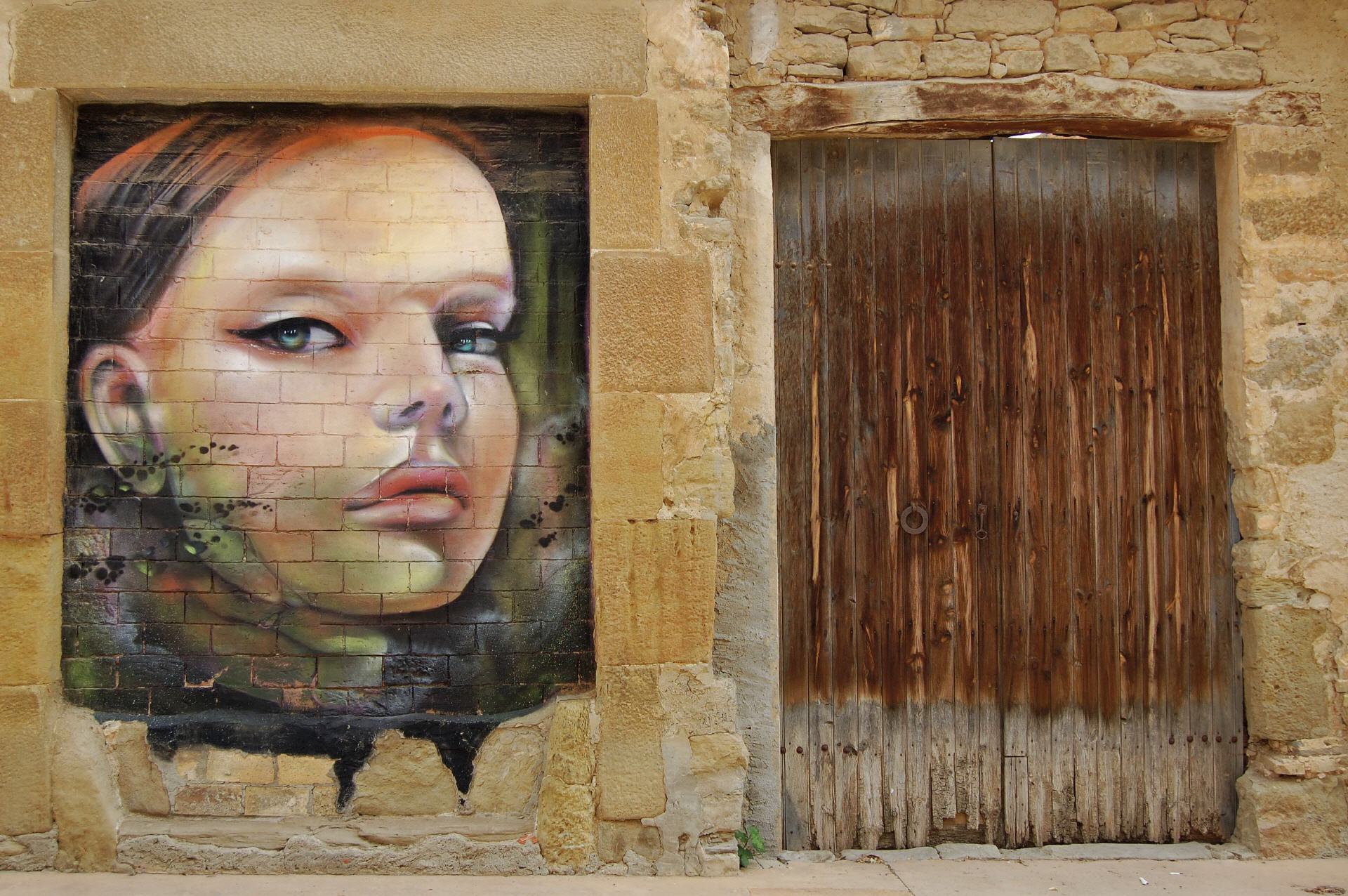 Una niña nos observa desde la pared de una casa en Penelles (Lleida). Es uno de los muchos graffitis que hay en el pueblo.